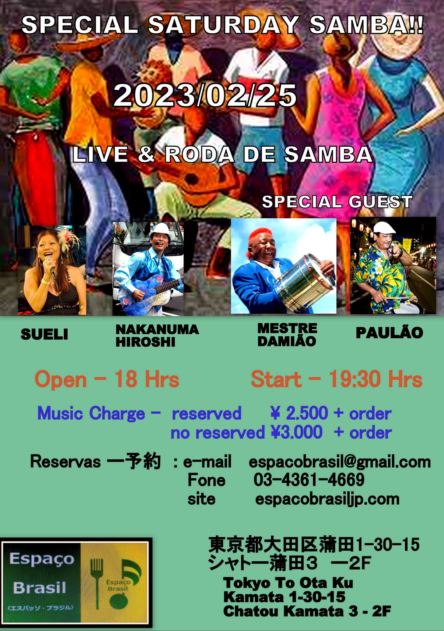 Open:18:30 Start19:30 MC:予約2500円 当日3000円 1drink+1Food+〈税〉 o. Stage – Live20. stage – roda 続きを読む “2023.02.25(土) スエリ具志〈Vo〉 Samba Live&Roda”