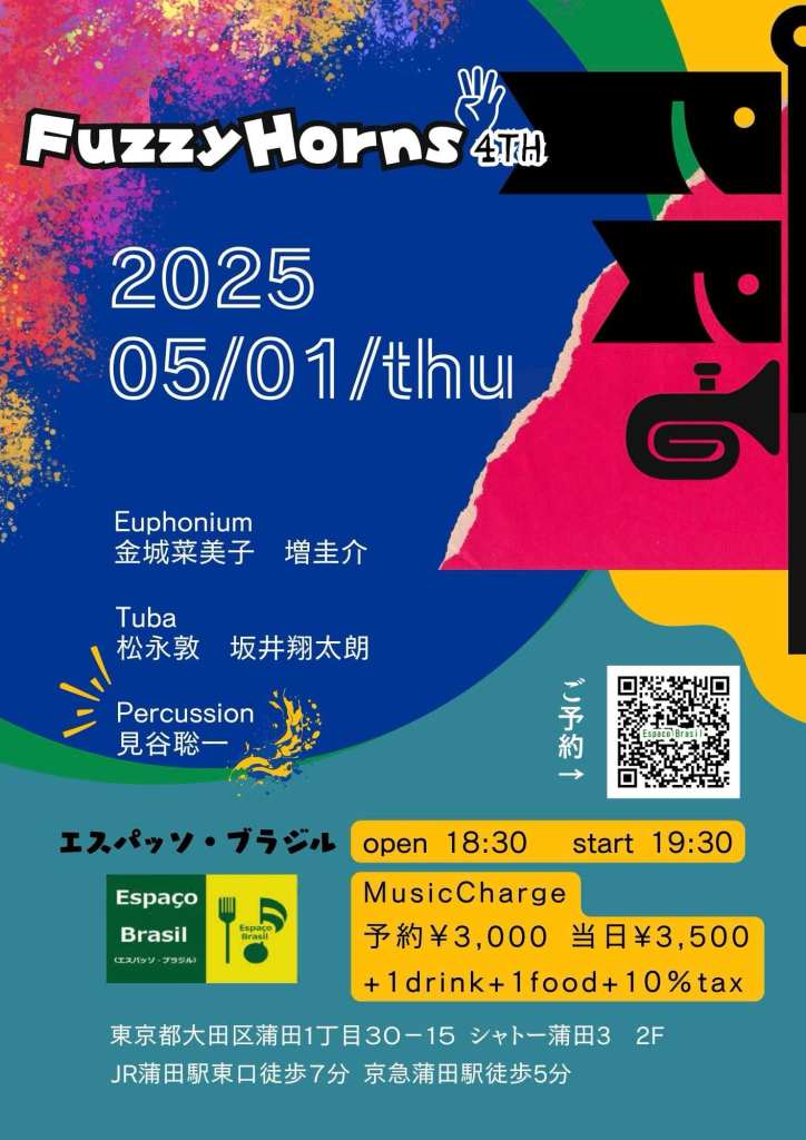 重量編成のユーフォニアム チューバカルテットにて軽音楽をお届けします。過去3回池袋にて盛況に終えたイベントのFuzzyHorns。今回は初上陸の蒲田エスパッソ・ブラジルではパーカッションに見谷総一の参加が決定!!よりポップに、よりハッピーな音楽をお届けします。