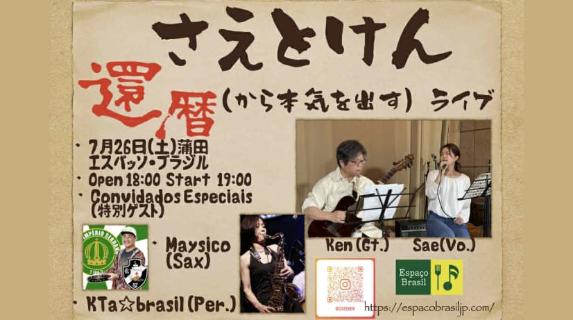 2025.07.26(土) さえとけん 投稿者:espacobrasilblog2025年6月11日2025年7月28日カテゴリー:ライヴタグ:終了 Open18:00 Start19:00MC:1,500円 + 1drink+1Food+〈税10%〉 Sae(vo)Ken(gt) 特別ゲストMaysico(Sax)KTa☆brasil(Per.)