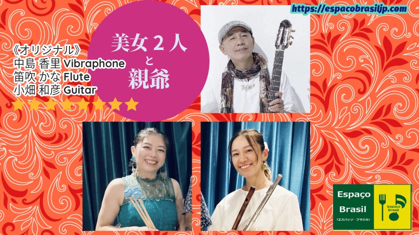 2025.10.28(火) 美女2人と親爺 投稿者:espacobrasilblog2025年8月18日カテゴリー:ライヴタグ:予告 Open:18:30 Start :19:30MC:予約3500円 当日4000円 +1drink+1Food〈税〉 《オリジナル》中島香里Vibraphone笛吹かなFlute小畑和彦Guitar